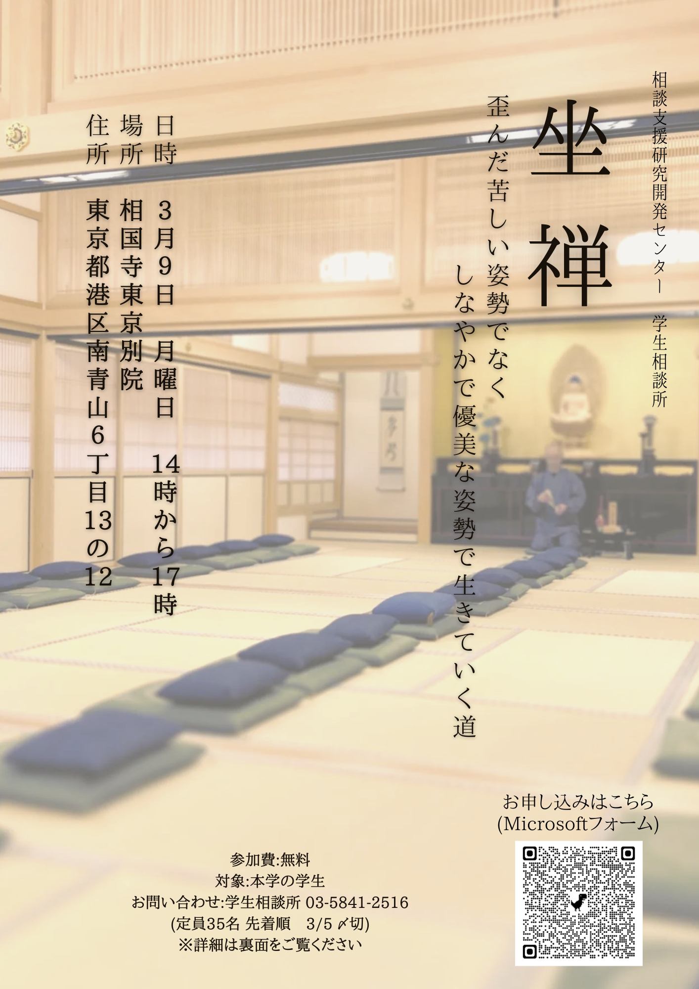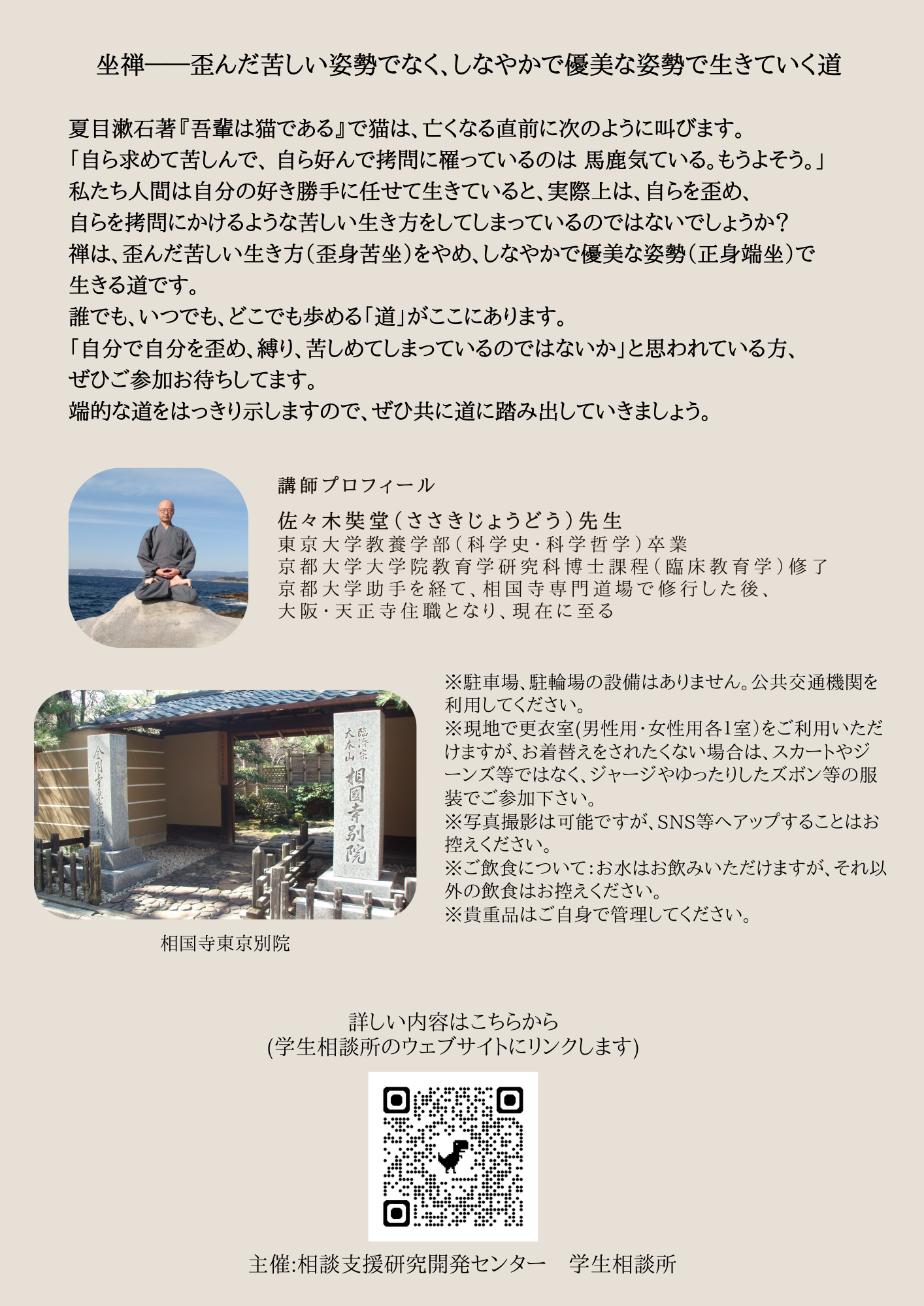 今年も学生相談所では、東大をご卒業された禅僧の佐々木奘堂先生をお招きして坐禅ワークショップを開催します。